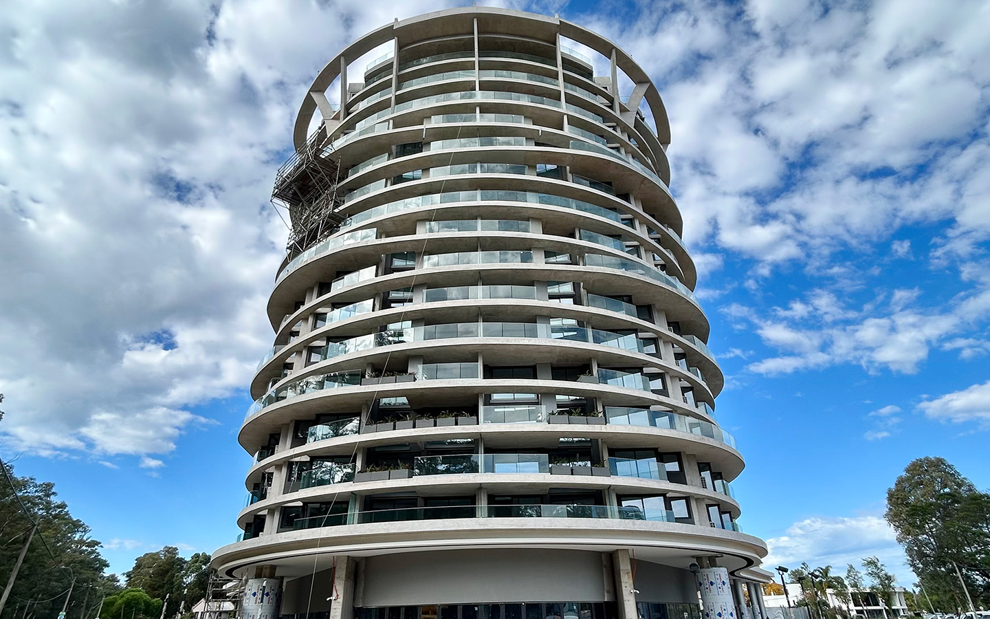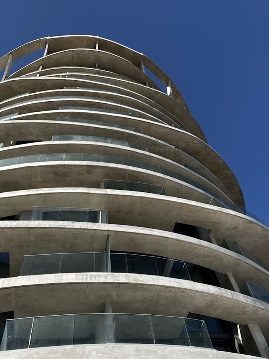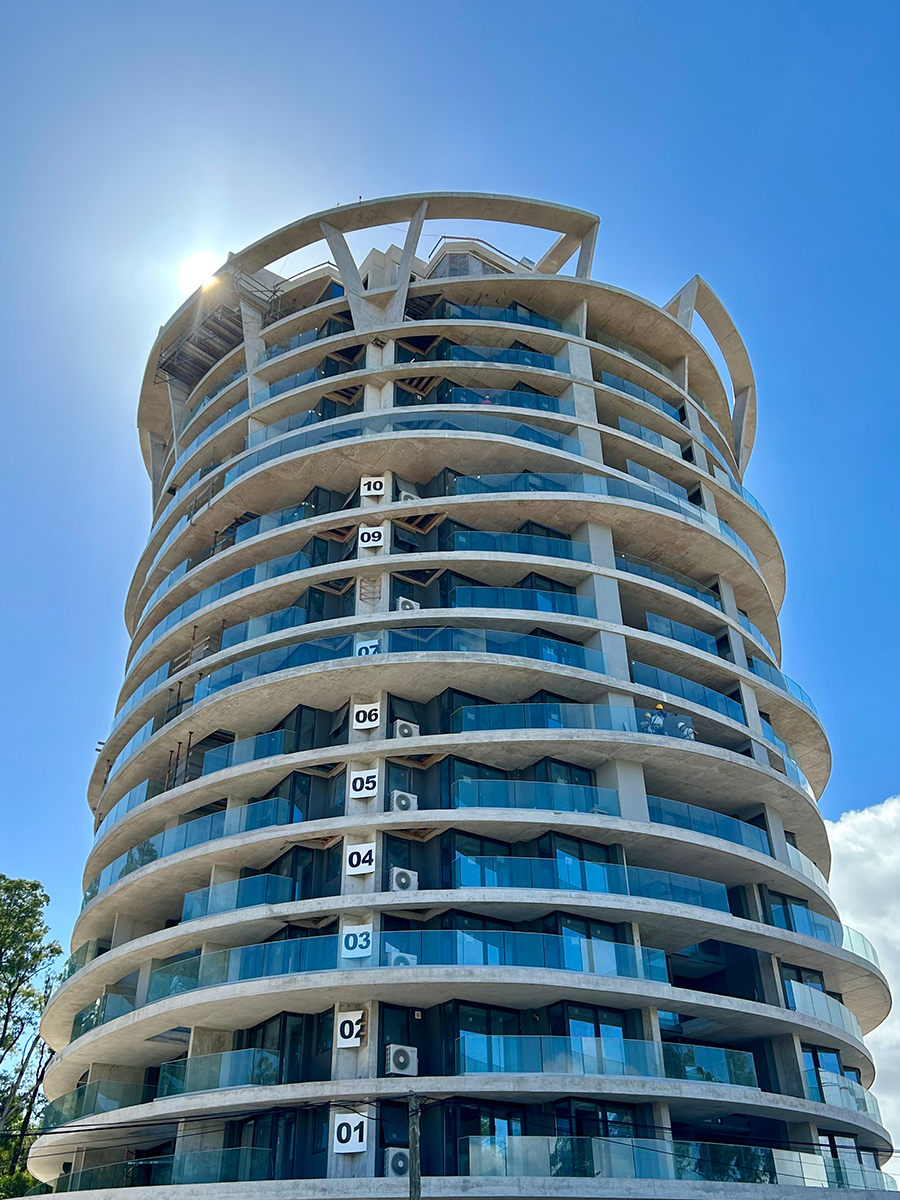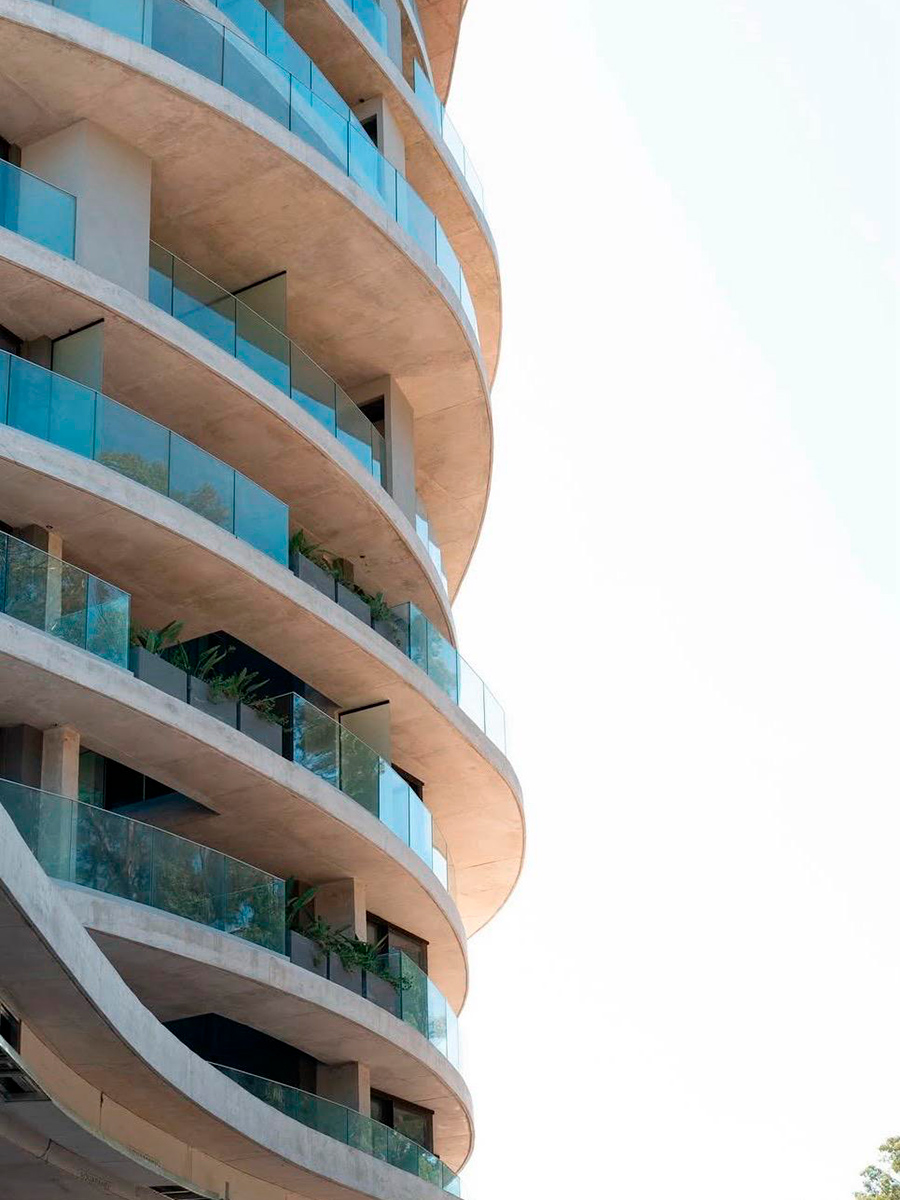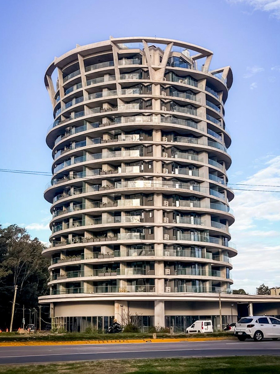 Se destaca por su diseño arquitectónico audaz y sus formas curvas que dialogan con el paisaje arbolado, integrando balcones y losas voladas que generan una volumetría dinámica y única, destacándose como un elemento estético y funcional.